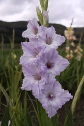 Высота 140 см. Соцветие 75 см, 25 бутонов (одновременно открыто до 10). Голубой с чуть сиреневатым оттенком, насыщенней к краям и фиолетово-синими стрелками по середине нижних лепестков. Округлый лепесток, элегантно гофрирован глубокими крупными складками и защипами. Ткани плотные, прочные, устойчивые к дождю и к солнцу.